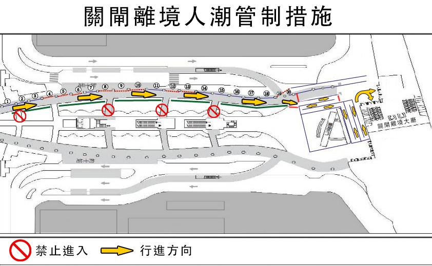 当关闸离境大堂出现大量通关人士导致人潮挤拥时,将会实施人潮管制措施。关闸广场风雨廊离境路段将实施“分流及分段放行”的措施(附图六),临时封闭该走廊两边,在特定位置设立出入口,让离境人士有序进入风雨廊轮候。