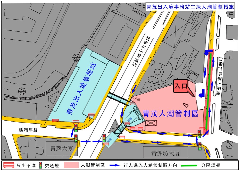 青茂口岸大楼各个地面层出入口将实施「只出不进」措施,届时大楼内的人群可以从地面各出入口处离开,大楼外的人士不可内进。而所有离境人士应前往白朗古将军大马路进入人潮管制区域轮候,依从警方指示通过行人天桥进入青茂口岸离境大堂。