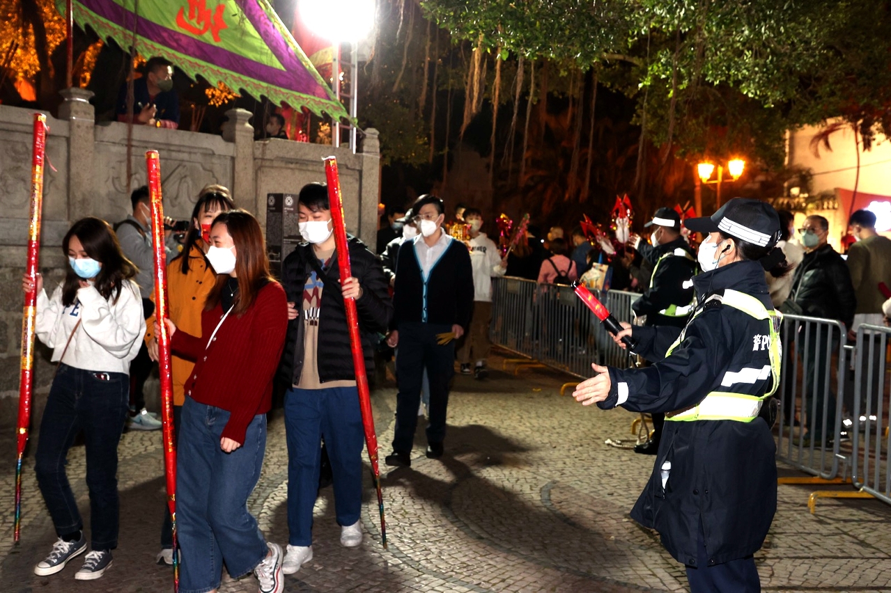 农历新年年三十至年初六(1月21日至1月27日)期间,本澳举办多项大型节庆活动,治安警察局在各区加强警务部署,包括于年三十晚上在众多庙宇外疏导人流,于年初一至年初三在本澳首办“新马路任我行——步行区试行计划”预先制定了预案及派遣人员在该区及周边进行疏导工作,同时亦于年初三晚上的农历新年花车汇演巡游路线及烟花表演观赏区域维持秩序。在上述活动中,市民及旅客均积极配合警方指示,整体秩序良好。此外,治安警察局亦派员到关闸口岸及旅游旺区进行预防罪案宣传,提高市民及旅客的防罪意识。