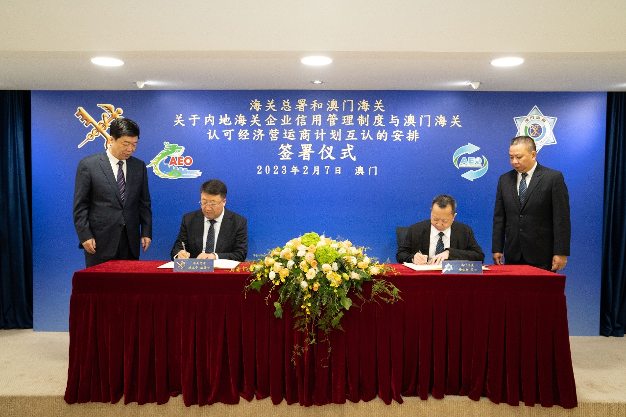 本月7日,海关总署副署长孙玉宁与澳门海关关长黄文忠在澳门海关总部大楼共同签署《海关总署和澳门海关关于内地海关企业信用管理制度与澳门海关认可经济营运商计划互认的安排》(下称《互认安排》),落实内地海关与澳门海关相互为对方认可的高信用企业提供便利通关措施。《互认安排》的签署有助提升澳门企业的竞争力,进一步推进粤港澳大湾区贸易安全与通关便利化,并为本地推出“认可经济营运商”计划创设有利条件。