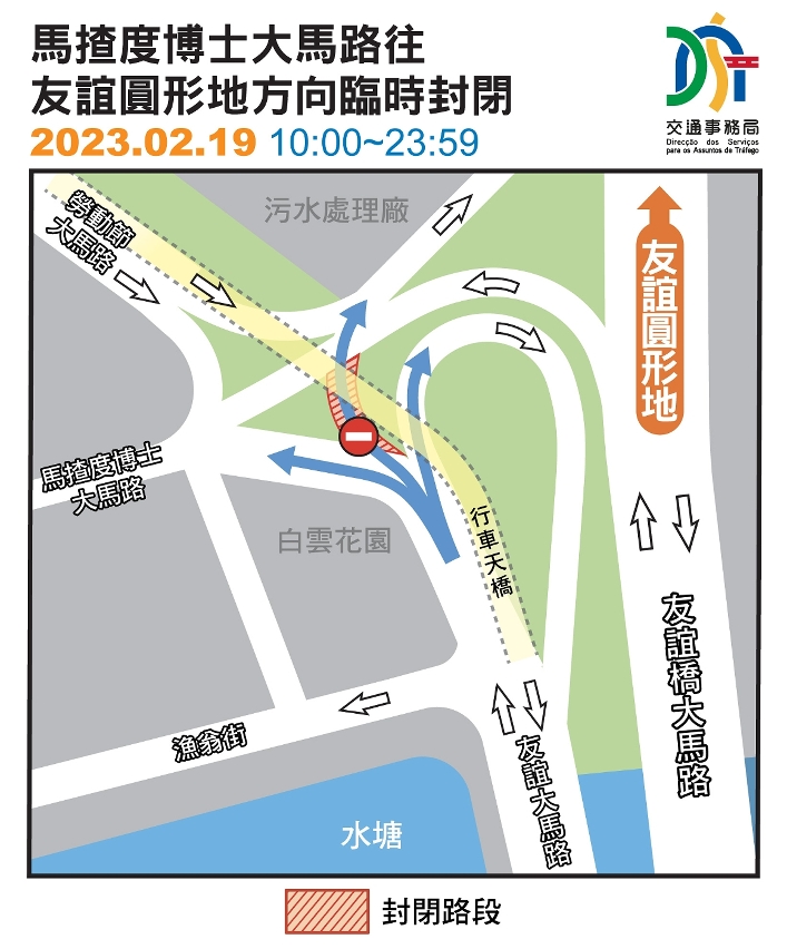 另外,配合友谊圆形地一带的交通安排,2月19日(周日)上午10时至23时59分,临时封闭马揸度博士大马路右转驶往友谊圆形地的路口。往关闸方向之车辆,可沿马揸度博士大马路右转进入黑沙环新街,再经由东北大马路或马场东大马路前往。