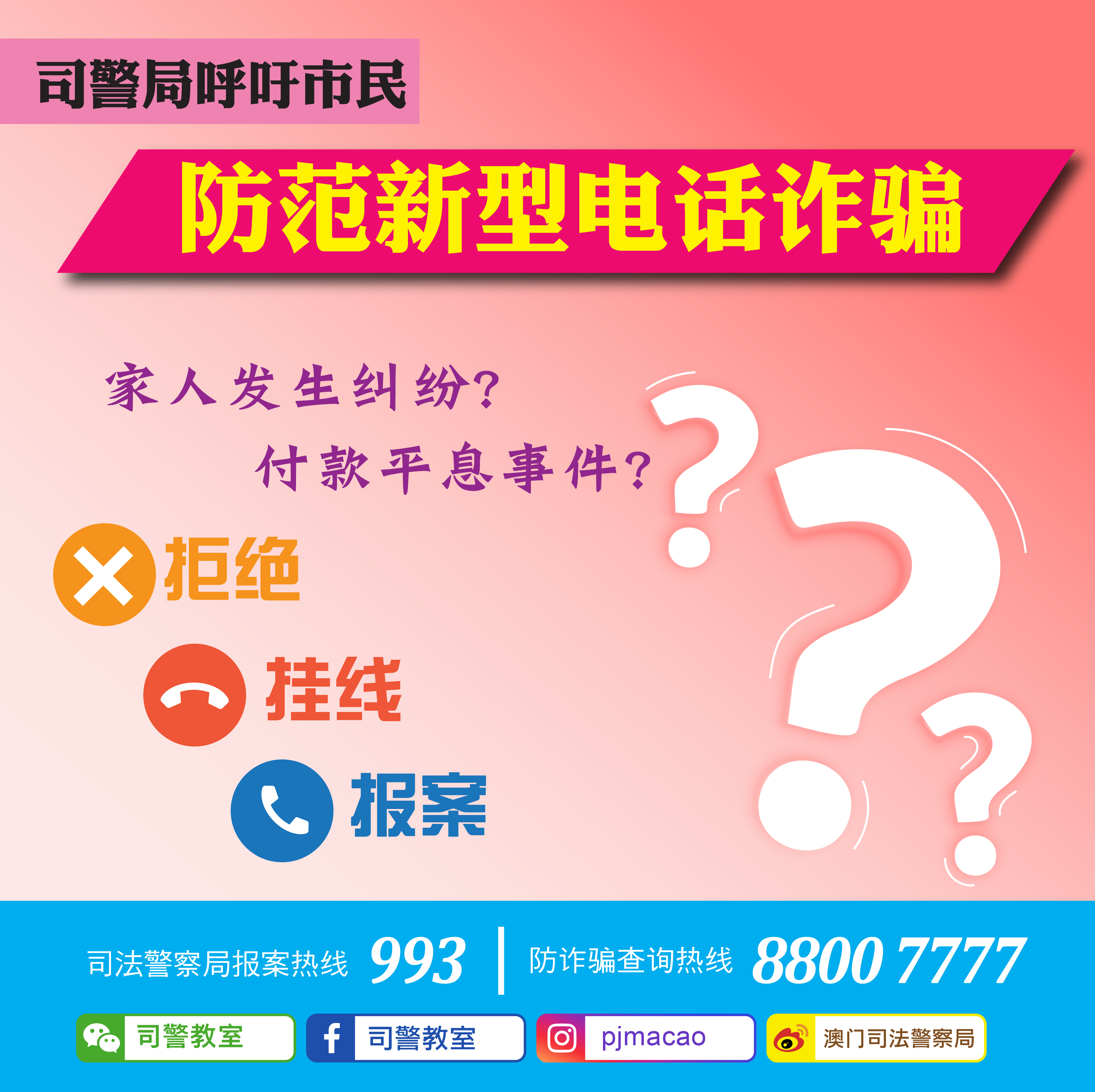 - 无论有否损失,主动“致电"防诈骗查询热线8800 7777或报案热线993。