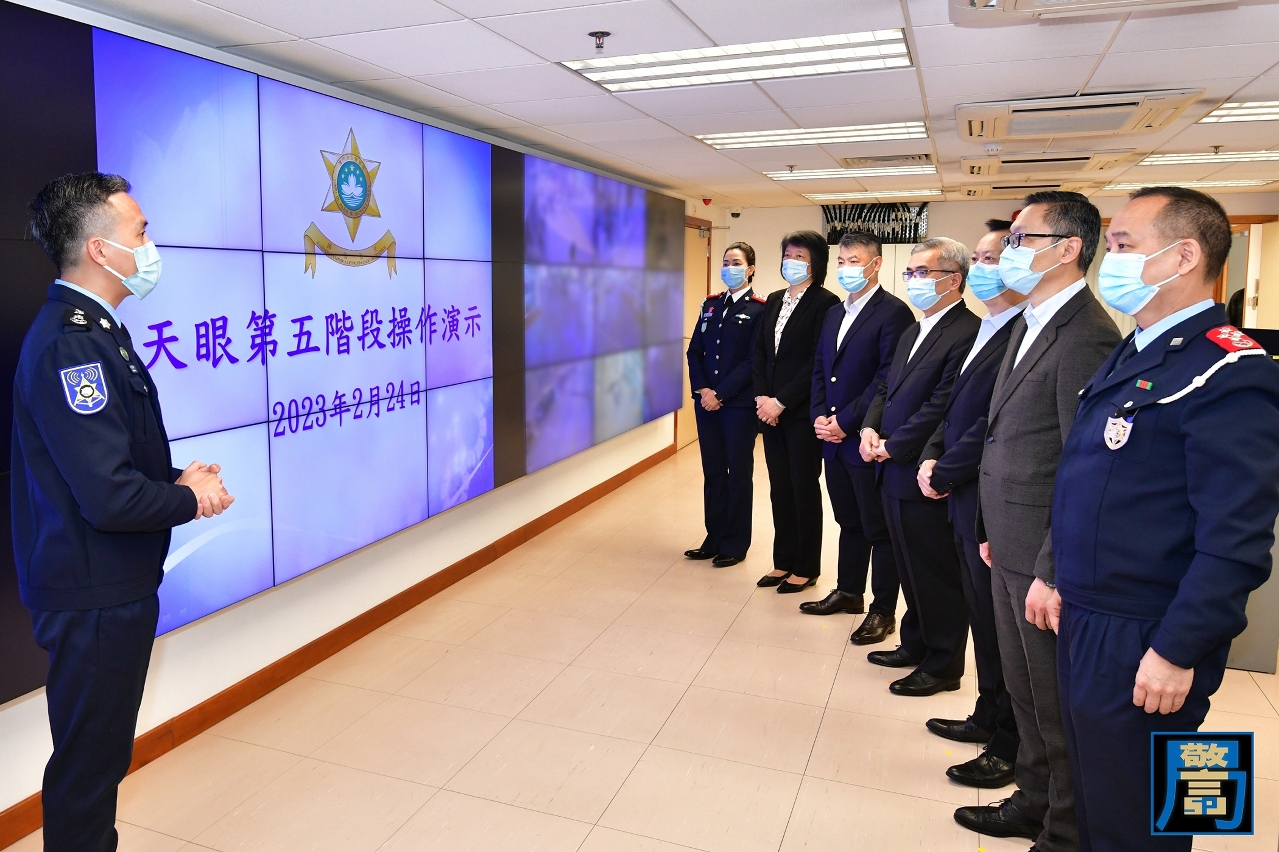 保安司黄少泽司长较早前带领警察总局梁文昌局长、海关黄文忠关长及一众保安范畴的领导前往治安警察局总部大楼内的“全澳城市电子监察系统”(下称“天眼”)控制中心,巡视及了解第五阶段“天眼”镜头的建设及运作程序的情况。