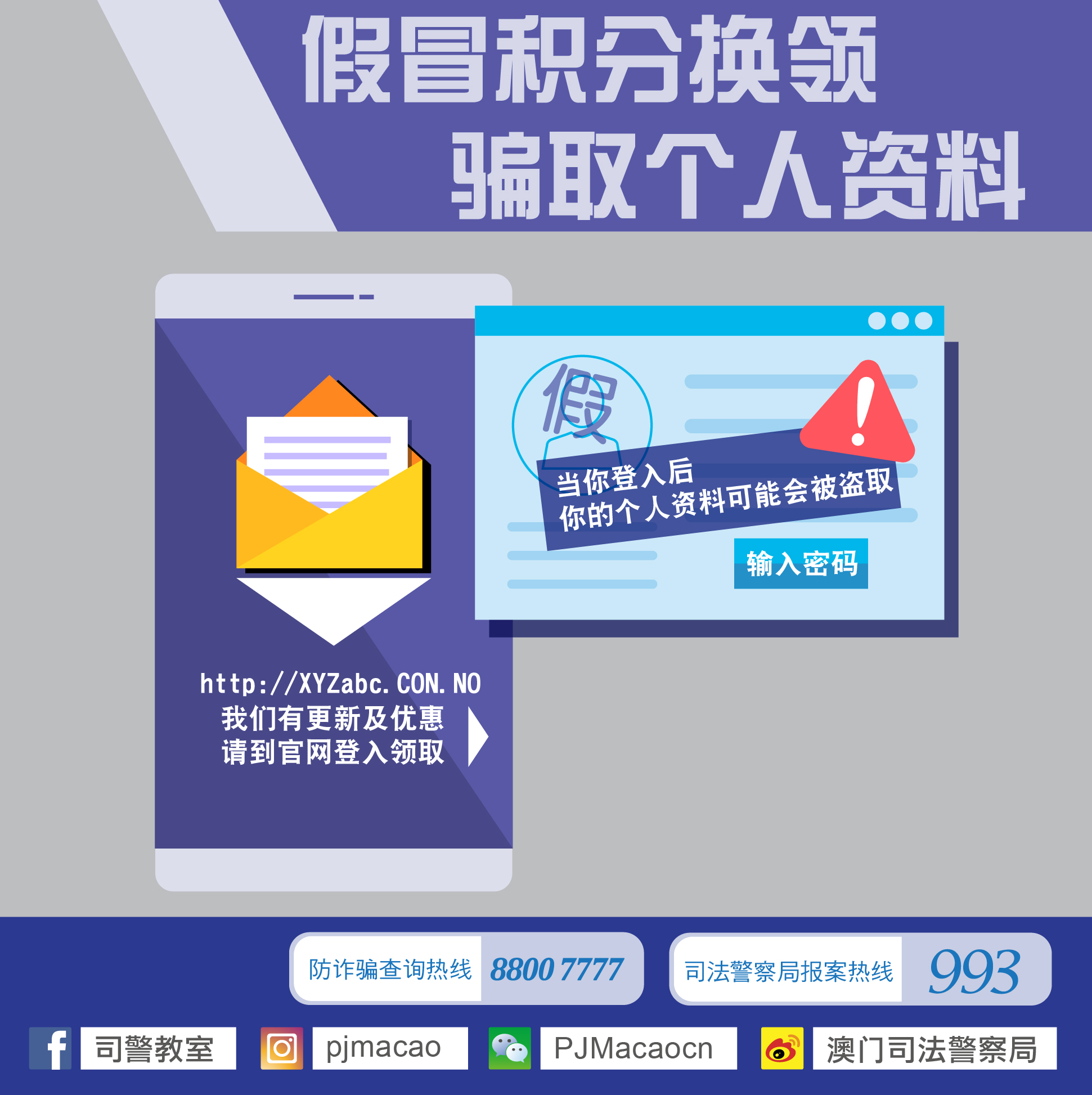 - 如遇到怀疑诈骗及其他犯罪时,请即致电司法警察局防诈骗查询热线8800 7777或报案热线993求助。