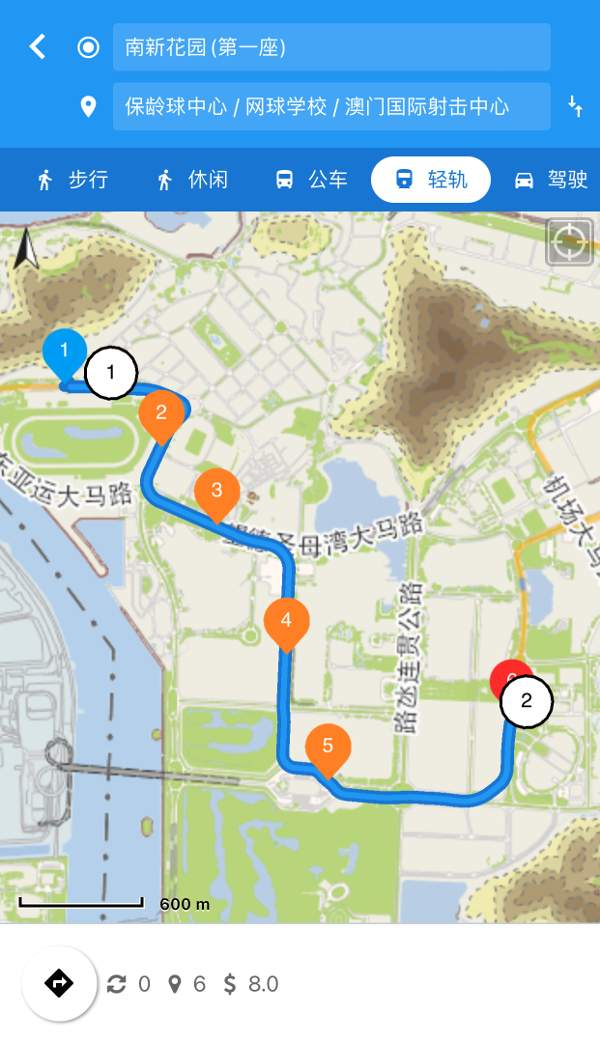 新版《澳门地图通》的出行路线规划功能,提供了最短的步行、休闲、巴士、轻轨及自行驾驶共五种不同的路线选择;新的轻轨路线查询功能除了协助用户搜寻邻近起点及终点的合适轻轨站外,更整合了步行与巴士转乘的建议路线,提供步行路线、轻轨或巴士搭乘站、途经站、下车站、转乘次数、乘坐站数以及费用等资讯,照顾用户不同的出行需求。