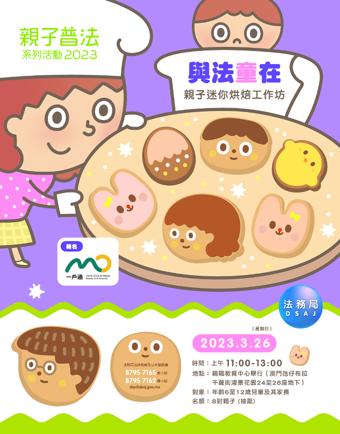 法务局将于本年3月26日举办“2023亲子普法系列活动”之与法“童”在—亲子迷你烘焙工作坊,并由即日起接受报名。