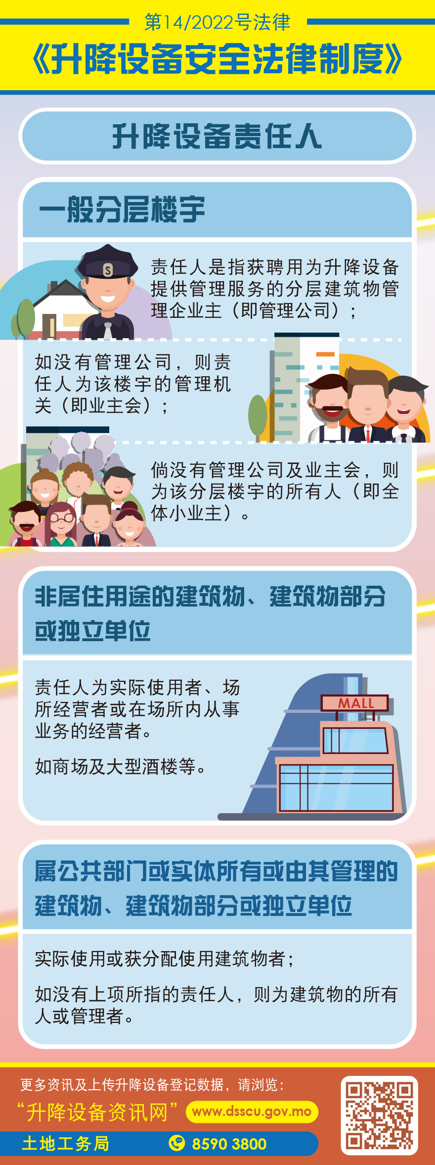 升降设备均须登记,并由责任人聘用专业实体定期对已登记的升降设备作检验及保养,确保设备处于良好的安全条件下运作。针对一般分层楼宇,责任人是指获聘用为升降设备提供管理服务的分层建筑物管理企业主(即管理公司),如没有管理公司,则责任人为该楼宇的管理机关(业主会),倘没有管理公司及管理机关,则为该分层楼宇的所有人(全体小业主)。针对非居住用途的建筑物、建筑物部分或独立单位,如商场或酒楼等,则责任人为实际使用者、场所经营者或在场所内从事业务的经营者。政府部门对其所有或管理的升降设备,亦有属于责任人的规范。