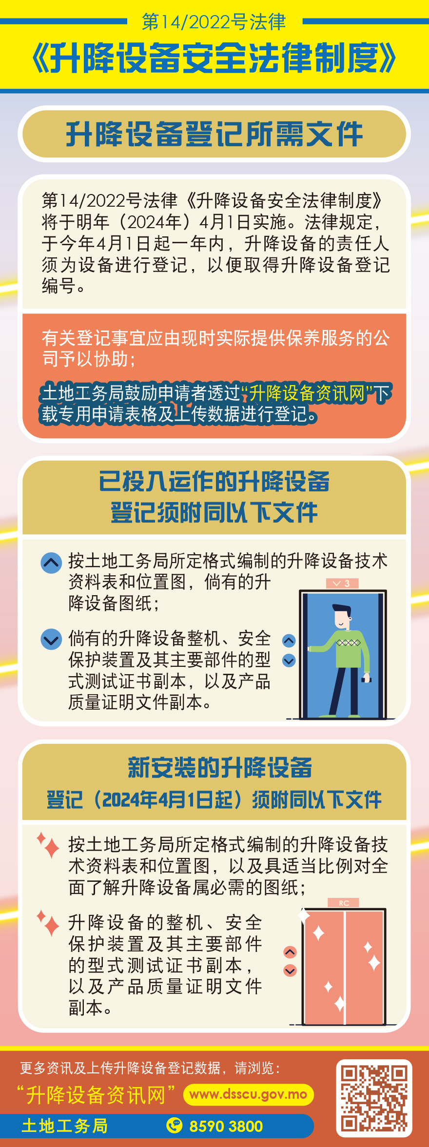 第14/2022号法律《升降设备安全法律制度》有关已投入运作的升降设备登记方面的条文于今年4月1日起生效实施,同日起,全澳所有符合法律适用范围的载人升降设备之责任人,均须在一年内为已投入使用的升降设备进行登记,以便取得升降设备登记编号,日后根据新规定展开后续的维修保养及定期检验。有关登记事宜应由现时实际提供保养服务的公司予以协助。