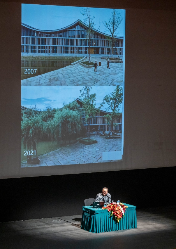 讲座上,王澍教授以自然、时间、乡土及建造四个元素,分享他的建筑理念及建筑设计的灵感来源,又分别以其多个享誉国际的建筑作品,包括中国美术学院象山校区、宁波历史博物馆、富春山馆、浙江文村等实例,阐述建筑与自然融合、与人民生活的关系,探讨了传统与现代结合的路径。他强调,城市与建筑的格局应符合“自然之道”,现代建筑设计要从古代建筑文化中汲取营养,让新建筑镌上当地人文历史的记忆。王澍的精彩演讲获全场观众热烈回应,结束时掌声经久不息。是次讲座特设同步线上直播,让未能亲身出席的观众亦能一同参与。