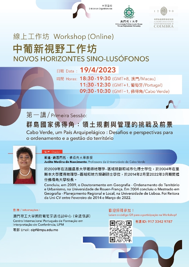 为进一步分析和深化《粤港澳大湾区发展规划纲要》提出的发展新机遇,支持构建澳门作为中国与葡语国家商贸合作服务平台,澳门理工大学国际葡萄牙语培训中心与科英布拉大学中国和葡语国家研究院联合推出 “中葡新视野"工作坊,邀请来自中国与葡语国家众多学术和专业领域的专家学者担任主讲。 “中葡新视野”工作坊第一讲将于4月19日(星期三)进行,由原佛得角大学校长茱迪·纳西门托(Judite Medina do Nascimento)主讲“群岛国家佛得角:领土规划与管理的挑战及前景”,欢迎有兴趣人士参与。