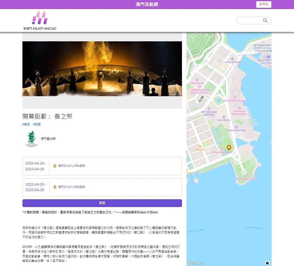 澳门活动网是一个整合本澳多元活动资讯的平台,以集中展示方式让市民及旅客瞭解各政府部门、大专院校以及各大综合度假休闲企业等的对外活动项目,方便市民游客“一站式”查找资料。网站内可按活动的“期间筛选”“项目分类”“关键字搜寻”以及“点选查看地图方式”搜寻活动资讯,若活动涉及预约与购票,亦可于活动网连结至各预约、购票平台。