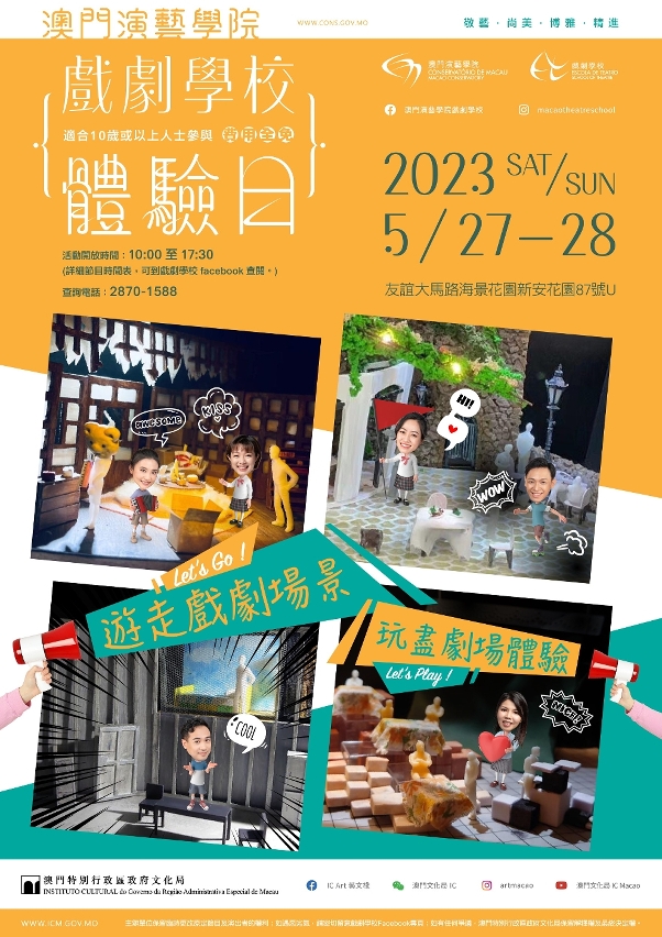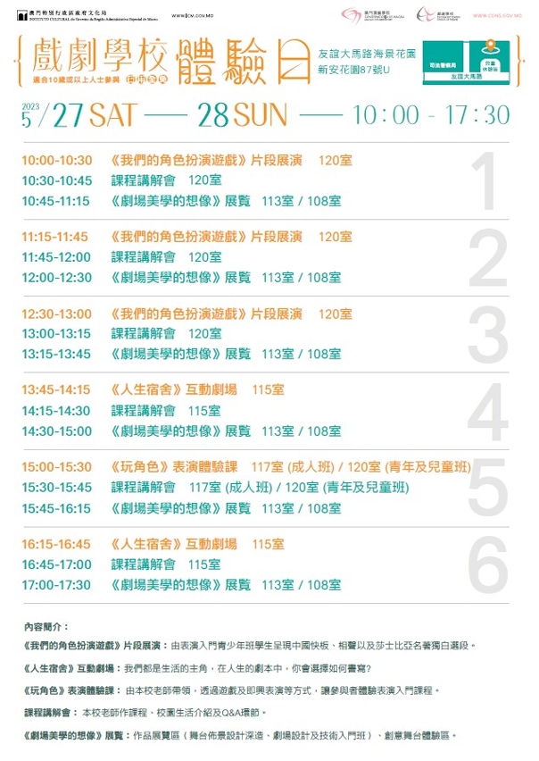体验日演出及活动适合10岁或以上人士亲临参与,费用全免。查询可于办公时间致电2870 1588,活动详情可浏览澳门演艺学院网页 www.conservatory.gov.mo 或关注脸书专页(搜寻“澳门演艺学院戏剧学校”)。