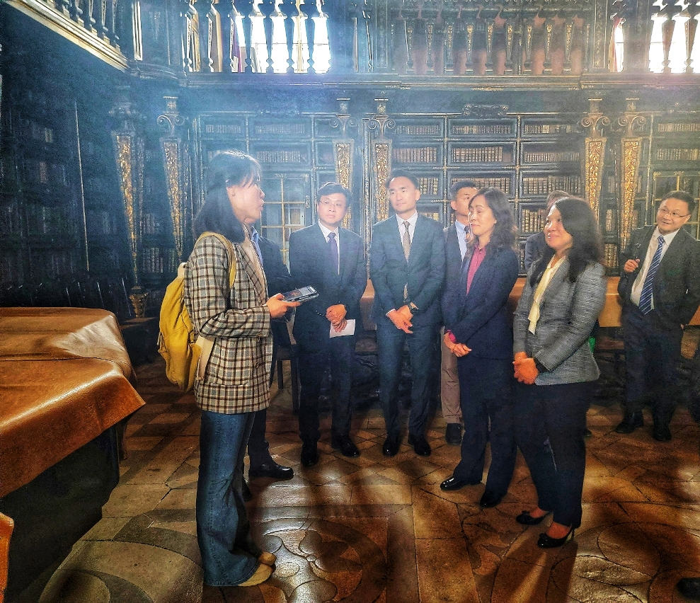 揭牌仪式后,欧阳瑜司长一行参观科英布拉大学于1728年竣工的世界文化遗产若安妮娜图书馆,考察由澳门理工大学电脑学课程师生研发、应用于若安妮娜图书馆的“基于云端的实时环境监察系统 — Canarin” 科技应用展示,以及听取澳理大科研团队介绍。有关系统透过收集环境数据,对科英布拉大学若安妮娜图书馆和科学博物馆极具重要历史文化价值的建筑物进行保护工作。该项专利技术曾在意大利举行的七大工业国组织高峰会之环保论坛展示,目前还应用于意大利博洛尼亚大学和博洛尼亚历史城区、法国巴黎大学及泰国亚洲科技大学,有效协助文化遗产的保育及环境保护工作,助力宜居城市的可持续发展,受到用户好评。