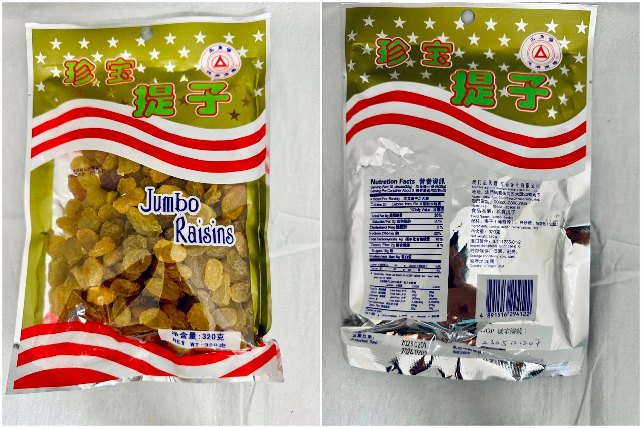 未能通过检测的预包装干制水果,产品牌子为“三角唛”,产品名称为“珍宝提子 Jumbo Raisins”,原产地为美国,净重320克,生产日期:2023.02.01,此日期前最佳:2024.02.01。该产品被验出每公斤含3180毫克的二氧化硫,超出本澳第7/2019号行政法规《食品中防腐剂及抗氧化剂使用标准》的规定。市政署已即时跟进,勒令涉事商户停售及回收有关问题产品。