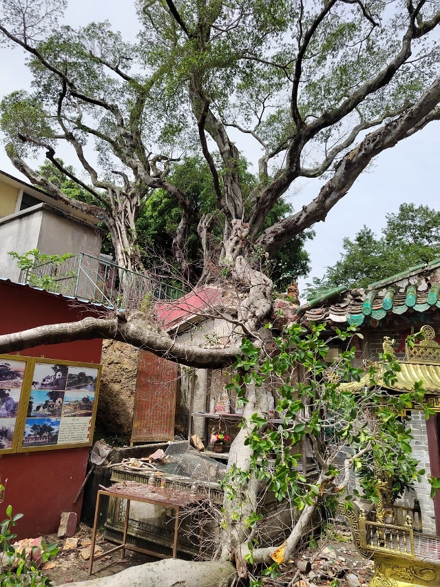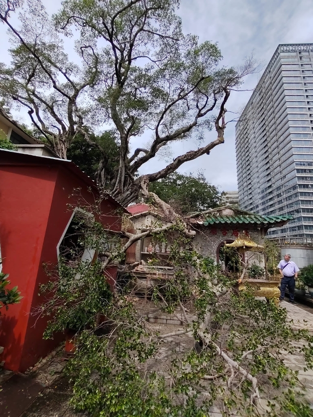市政署关注渔翁街天后庙古榕树断枝事件,接报后即派员到场了解,并围封受影响范围。树木折断部分为直径约45公分、长约逾五米的分枝,经初步检查,因断枝的木质腐枯较严重,估计因近日连场暴雨加重树枝重量,致无法承受自身重量而折断。市政署将持续监察古树的情况,协助庙方跟进处理。
