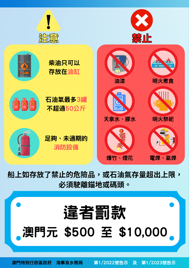 继去年刊登《告示》规管渔船锚泊内港锚地的安全应遵守则后,为进一步加强内港的渔船安全监管工作,局方今日刊登了第1/2023号《告示》,订明渔船停靠内港各码头的安全应遵守则,包括靠泊前须以电子方式申报,限制渔船靠泊码头时燃油的存放方式、设定石油气存量上限,禁止明火煮食、进行明火的祭祀活动和维修作业等。有关守则与现时渔船停泊内港锚地的要求基本一致。