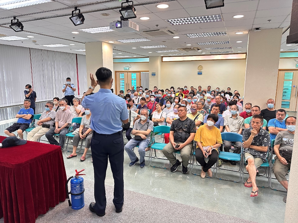 讲座于六月二十一日在营地活动中心举行。消防局代表于讲座上介绍多项防火应急安全知识,如离开时应关闭所有用电设备、保持周边疏散通道畅通、切勿储放易燃物等,提醒人员应正确使用电器,定期保养维护用电设备等。