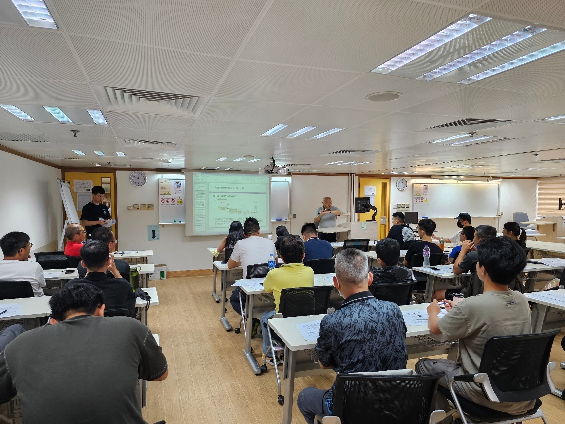 在工作坊上,导师向学员简介澳门中水回用的推动情况,中水的用途及水质标准;并从理论角度介绍澳门现行的供水规范,讲解楼宇双管道供水系统的概念,以及教导学员识别喉管物料、使用三型聚丙烯管(PPR)管材所需的接驳技术、安装的注意事项等;同时,辅以楼宇建筑图则实例,让学员认识如何读图、辨析楼宇的供水系统。学员亦在导师的指导下,就PPR管材施工进行实务操作练习。