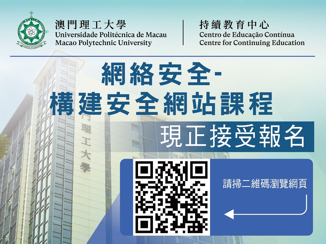 上述课程以广东话授课,可使用教育及青年发展局持续进修发展计划个人进修帐户支付,出席率达总课时85%并通过评测可获由澳门理工大学持续教育中心发出的证书。报读课程人士可透过网上报名或于澳门理工大学持续教育中心报名,“网络安全–维护安全网站”课程报名日期至2023年7月19日,“网络安全–构建安全网站” 课程报名日期至2023年8月11日,额满即止。有关课程资讯请浏览专页https://www.mpu.edu.mo/zh/cec_short_courses.php,查询报名手续可于办公时间致电87950832 / 87950750 / 87950707或电邮至cec@mpu.edu.mo。