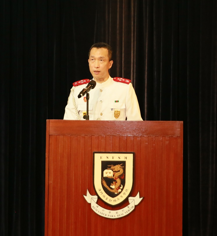 校长黄子晖在致辞时,先总结澳门保安部队高等学校在建校三十五年来的成果,表示今学年成功开办的社会科学硕士学位(治安管理)课程,开拓警务高等教育新里程。作为保安部队及保安部门的培训教育基地,保安高校紧贴社会发展现况,将继续举办各类型的警务教学及学术交流活动,汇集专家学者们的意见和智慧,进一步探索社会治安防控的策略,以理论知识和科学的态度强化保安部队及保安部门应对新型罪案的能力,切实履行维护社会繁荣稳定和保障市民安居乐业的职责。同时,开展新型教学培训,提升人员专业水平,加强国家意识及爱国爱澳精神。