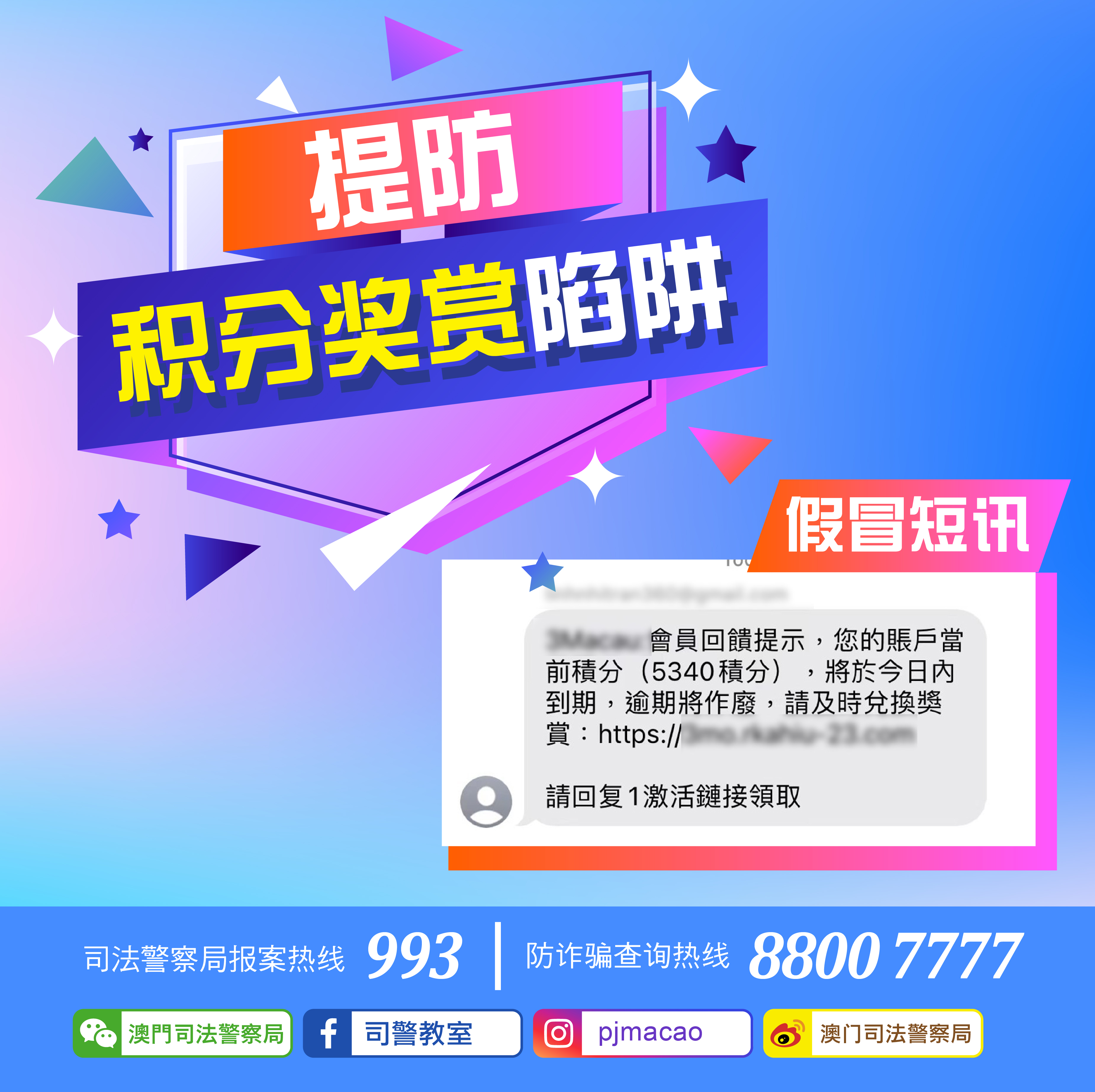 司法警察局近日再次发现怀疑假冒本澳某电讯公司的短讯,以积分到期须尽快换领奖赏为由,要求事主登入虚假网站,藉此套取个人资料及信用卡资料。经查,证实相关电讯公司并无发出上述短讯。