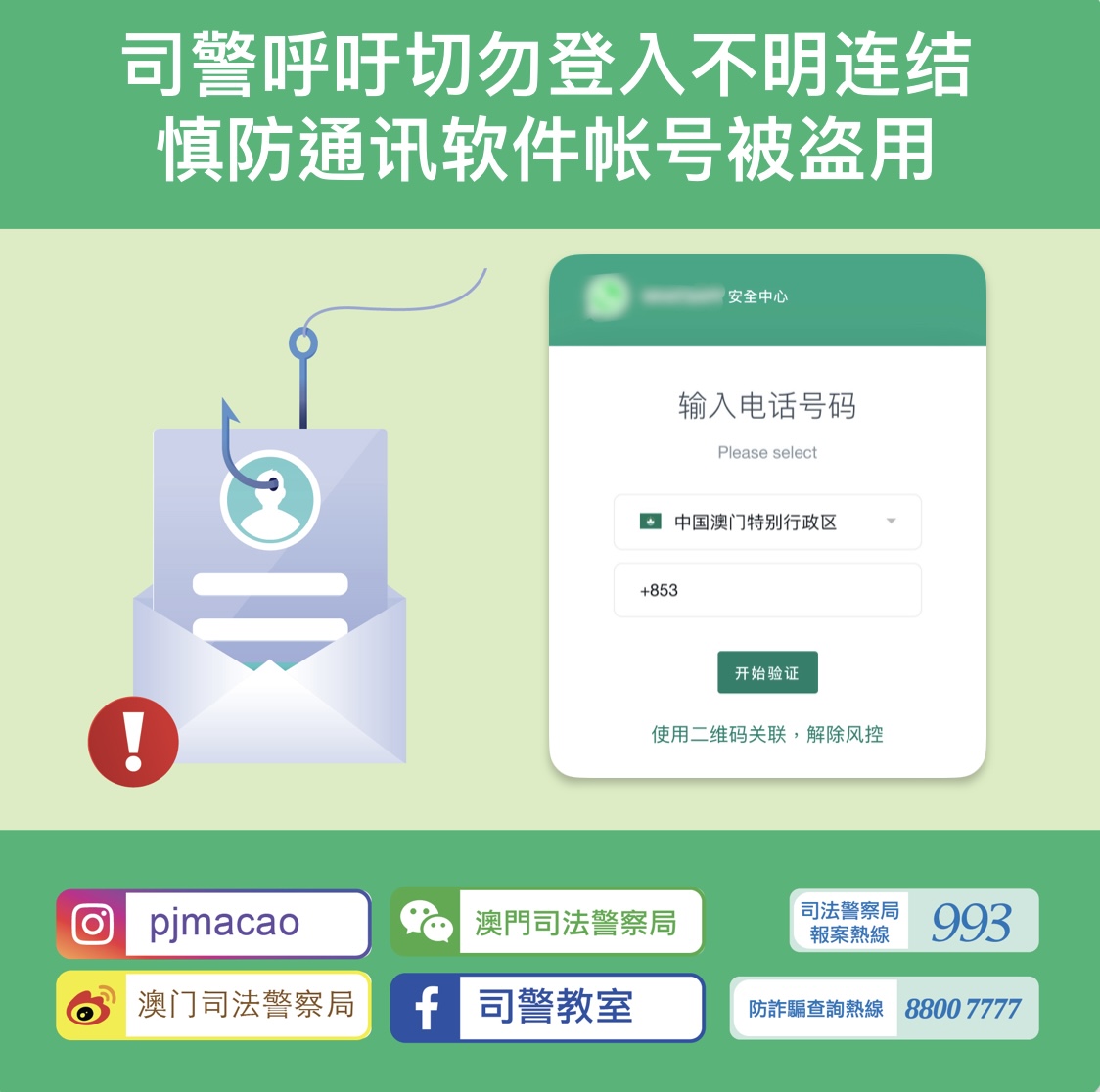 鉴于近年不法份子透过上述手段盗取市民通讯软件帐号后,再向该帐号内的”好友”进行诈骗,部分案件更造成财产损失。为此,司警局呼吁市民,切勿点击来历不明的短讯连结,应循官方渠道确认短讯内容的真实性,以及小心核对连结及网页上显示的相关资料是否正确,切勿轻易提供个人或验证码等资料。如怀疑遭到诈骗,应立即致电司警局防诈骗查询热线8800 7777或报案热线993求助。