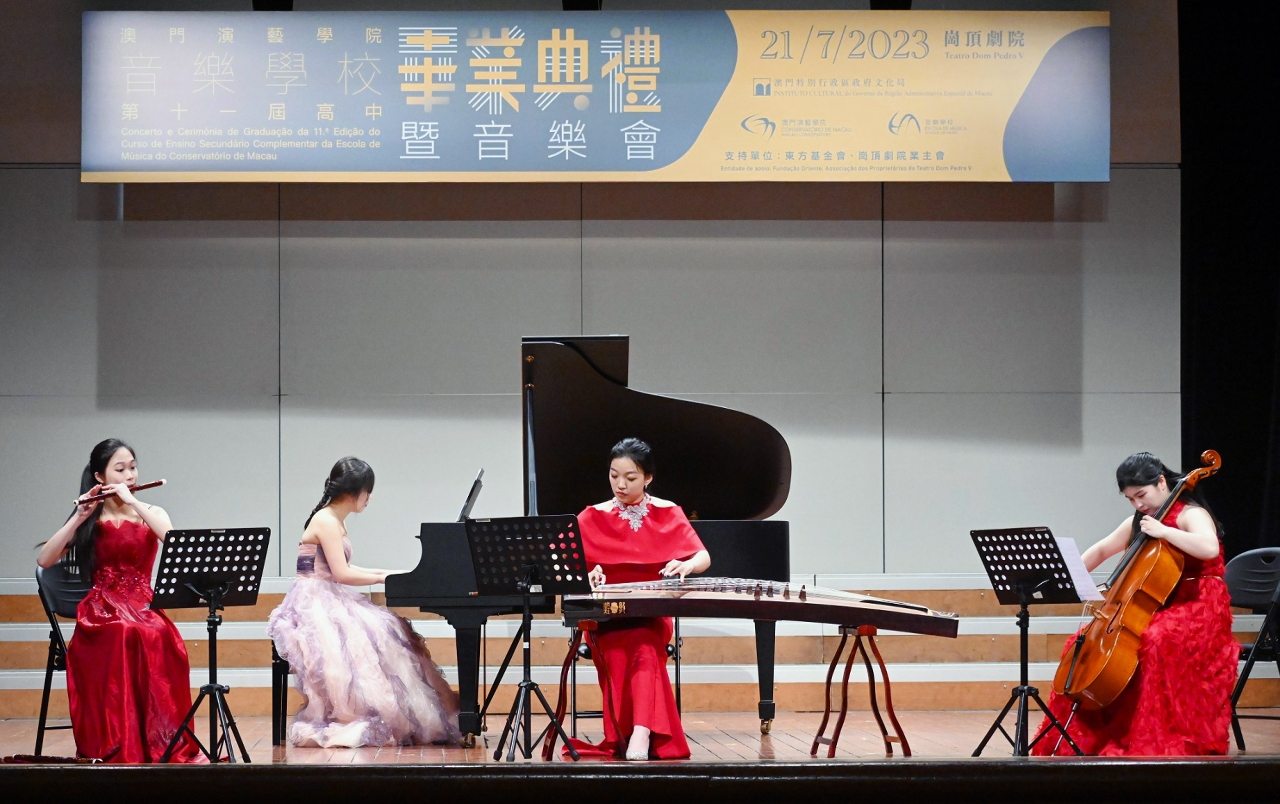 音乐会上,毕业生进行了不同器乐的重奏表演,汇报多年的学习成果,展现扎实的演奏技能,文化局副局长张丽珊、中央音乐学院附中校长娜木拉、文化局澳门演艺学院代院长陈理理、教育及青年发展局小学及幼儿教育处处长蔡敏芝、中葡职业技术学校校长陈盛畴、中葡职业技术学校副校长潘维念以及音乐学校代校长刘晨晨等出席典礼。