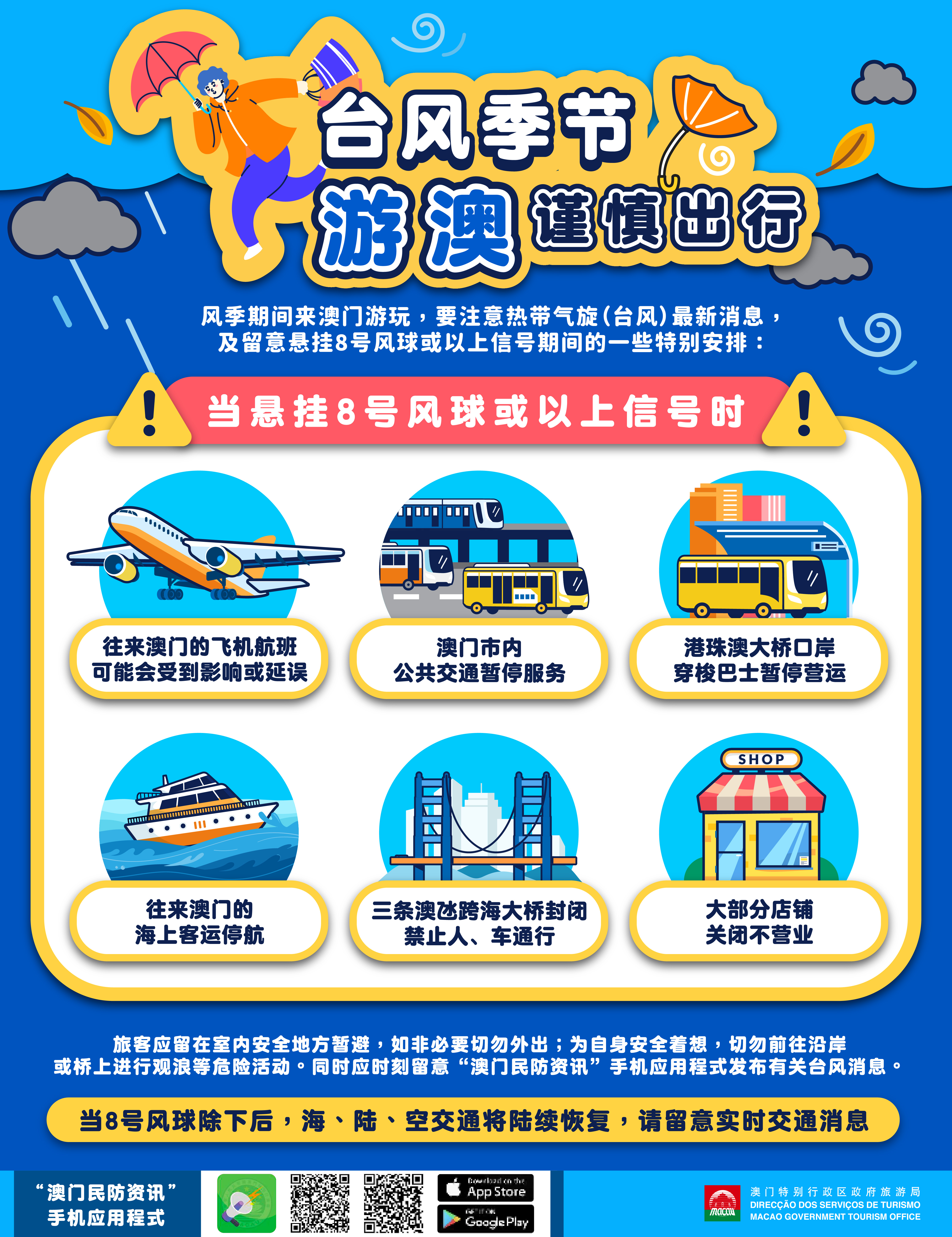 澳门已进入台风季节,旅游局持续透过不同渠道提醒旅客留意台风讯息及相关事项,包括桥梁开封、口岸及交通等服务的安排,同时又以图文包及宣传短片的形式向旅客宣传台风季节游澳门的注意事项,继续优化台风讯息发放工作,提升旅客出行体验。