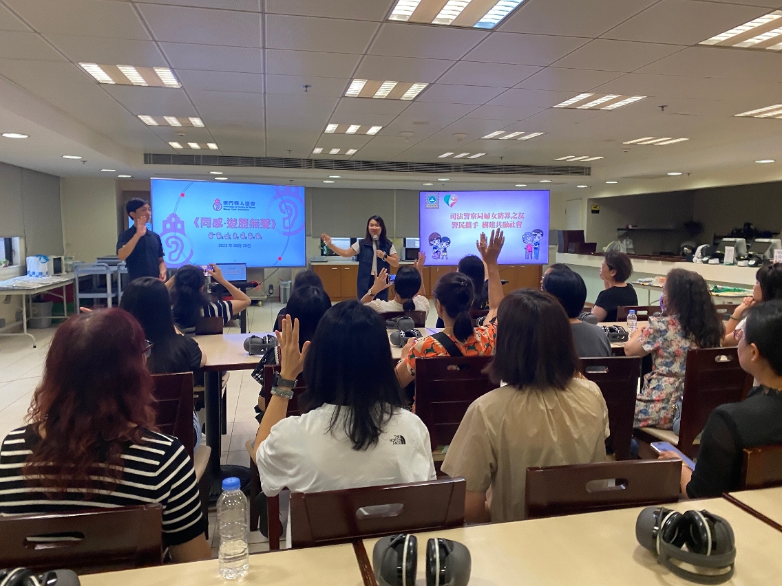 活动于8月26日下午在司警局总部大楼举行。活动中,澳门聋人协会导师向“司警局妇女防罪之友”成员介绍该中心的服务和运作,并教授与听障人士沟通的技巧和实用手语;随后进行无声体验环节,安排成员们在模拟茶餐厅的场景中体验听障人士在日常生活中面临的不便之处,进而增进并发挥其同理心,瞭解如何与听障人士沟通和相处,最终做到“多一点认识,多一点接纳”。