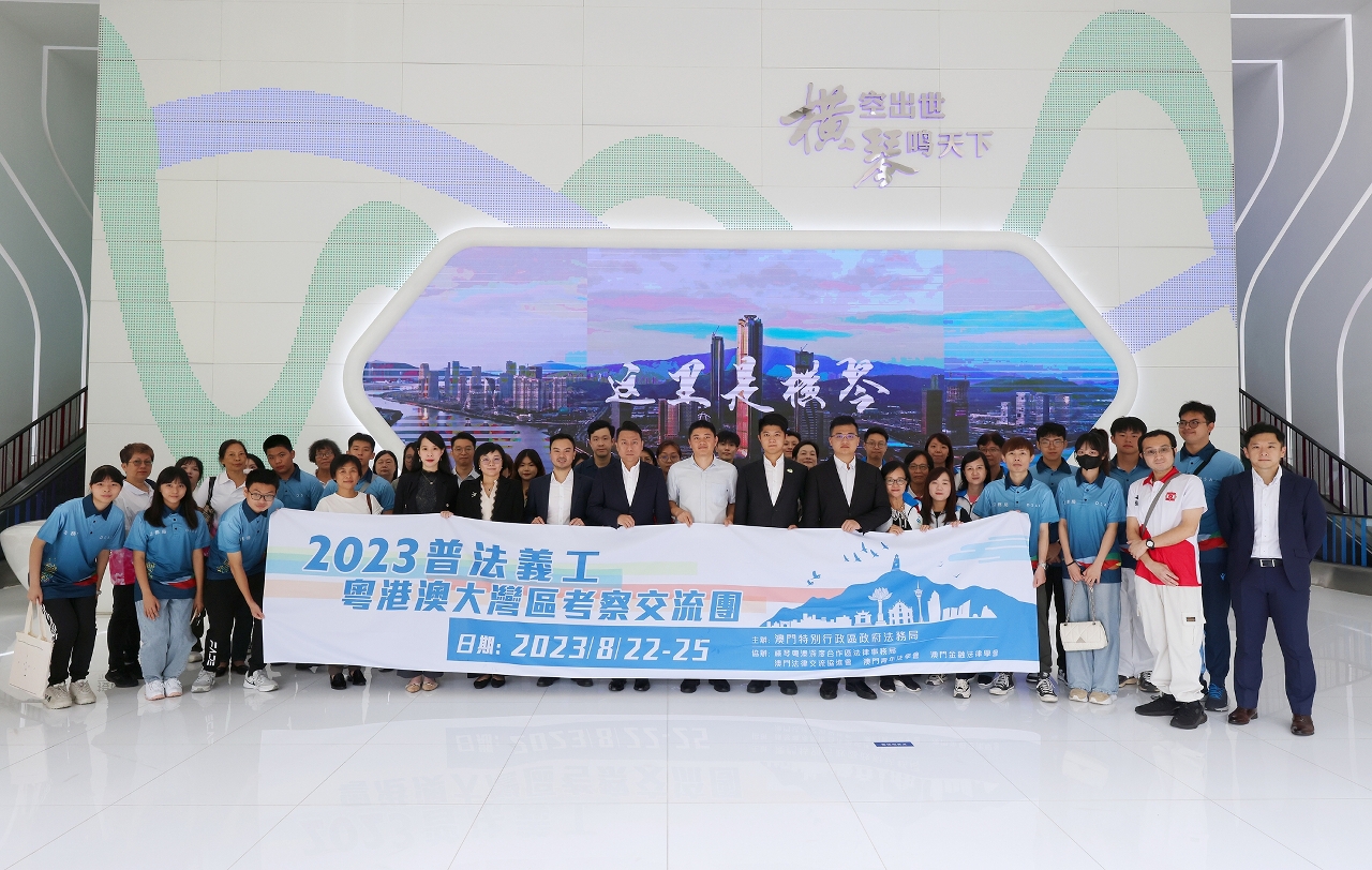 由法务局主办,澳门法律交流协进会、澳门金融法律学会和澳门青年法学会协办的“2023普法义工粤港澳大湾区考察交流团”于8月22日至8月25日前往横琴粤澳深度合作区和广州进行考察交流,交流团由澳门青年法律工作者、“普法动力”青年义工团、澳门妇女普法义工团、澳门社区普法义工团和工青普法义工团,合共50人组成。