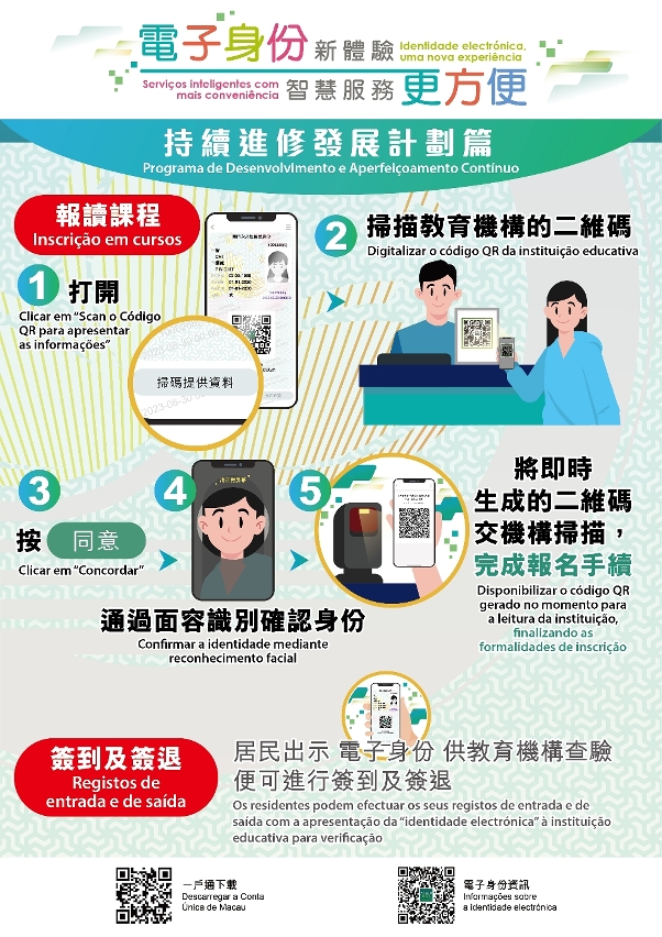 有关《持续进修发展计划》详情,请参阅相关专题网页(https://www.dsedj.gov.mo/pdac/)。更多“电子身份”资讯,请浏览专题网页(https://www.dsi.gov.mo/eid/index.html)。如有查询,请致电身份证明局热线(2837-0777或2837-0888)。