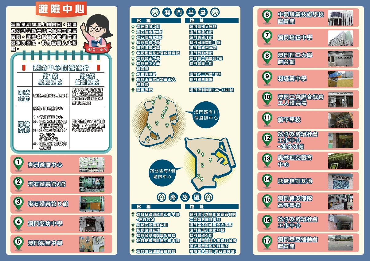 在此亦提醒旅客,需密切留意本澳各项应对热带气旋的措施,包括发出8号风球信号时,本澳三条跨海大桥和莲花大桥将采取封闭措施、公共交通亦会停止运作;若发出橙色或以上风暴潮警告时,低洼地区更会采取 “台风期间风暴潮低洼地区疏散撤离计划”,请旅客及早了解附近的避险中心位置及听从现场警务人员安排。