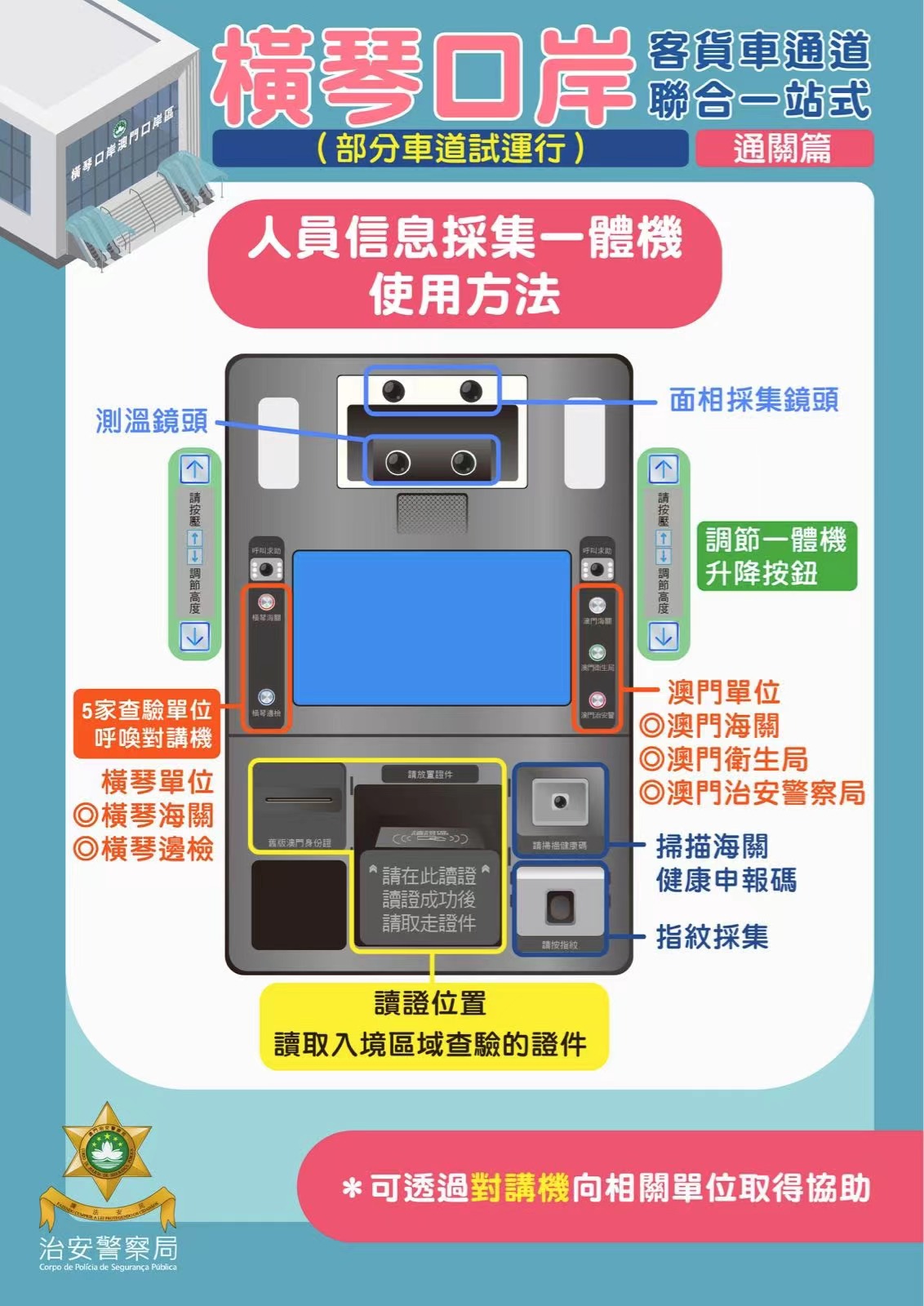 使用自助快捷通道时,驾驶员使用出境方的「人员信息采集一体机」自行读取入境区域查验证件(如:澳门居民前往横琴读取港澳居民来往内地通行证,前往澳门读取澳门居民身份证)。请注意,自助快捷通道不适用“我的通关”二维码。