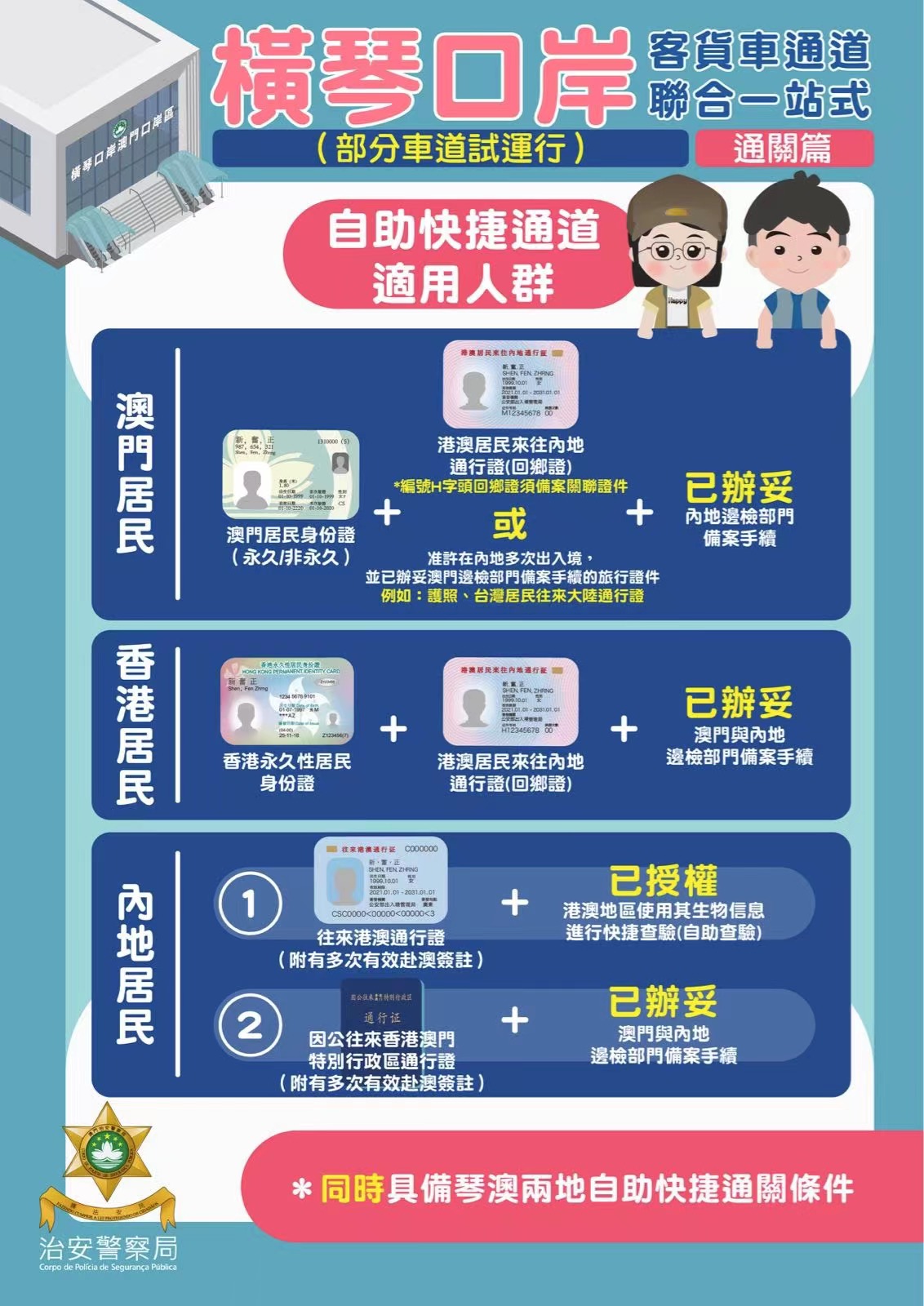 以下同时具备琴澳两地自助快捷通关条件的驾驶员,可驾驶合资格的非载客车辆使用自助快捷通道。