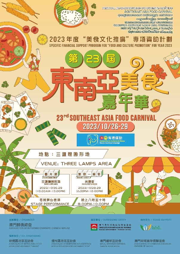 第二十三届东南亚美食嘉年华将于10月26至29日,一连四日在三盏灯圆形地及光复街一带举行,联动本地东南亚特色餐饮商号,推广三盏灯一带的品目繁多的东南亚美食。系列活动包括美食一条街、文艺晚会、图片展等,透过多元文化碰撞,为澳门“美食之都”的美誉添姿加彩。