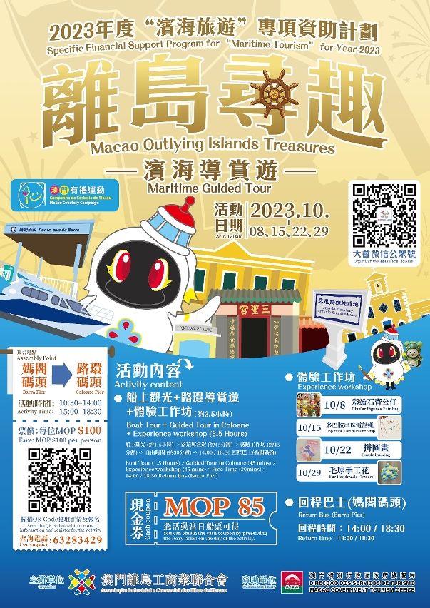 “离岛寻趣‧滨海导赏游” 将于10月8、15、22和29日,一连四个星期日进行,每日提供2班海上游航班,由导游带领从妈阁码头出发,经海上游航线前往路环码头。沿途介绍路环的历史文化,并游览路环市区和体验工作坊,参加者更有机会与澳门旅游吉祥物“麦麦”互动和合照。活动也联动区内商户,提供消费优惠券,促进社区经济。