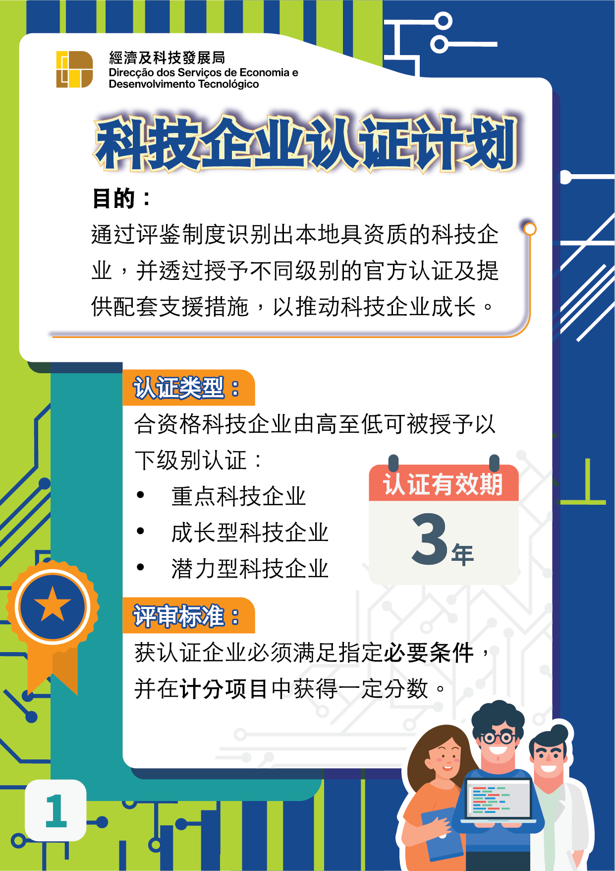 《科技企业认证计划》每年5月及11月开放申请,按评审结果由低至高依次对合资格企业授予“潜力型科技企业"、“成长型科技企业"或“重点科技企业"的认证资格。通过评鉴制度识别出本地具资质的科技企业,配合支援配套措施,鼓励科技创新及支持高新技术产业发展,以及吸引科技企业落户澳门。
