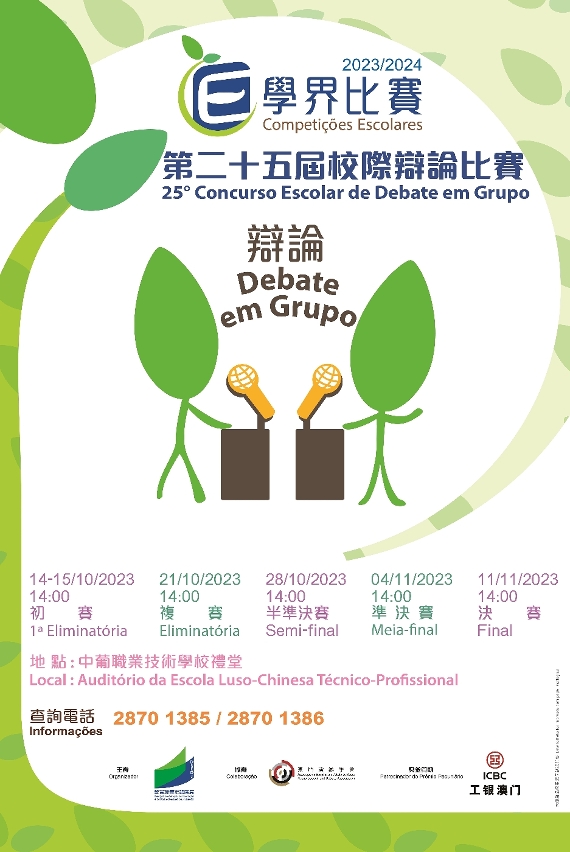 为培养学生的分析和逻辑思维能力,训练其语言表达能力和技巧,由教育及青年发展局主办、澳门演辩学会协办、中国工商银行(澳门)股份有限公司赞助奖金的2023/2024学年“第二十五届校际辩论比赛”将于2023年10月至11月期间假中葡职业技术学校礼堂举行。