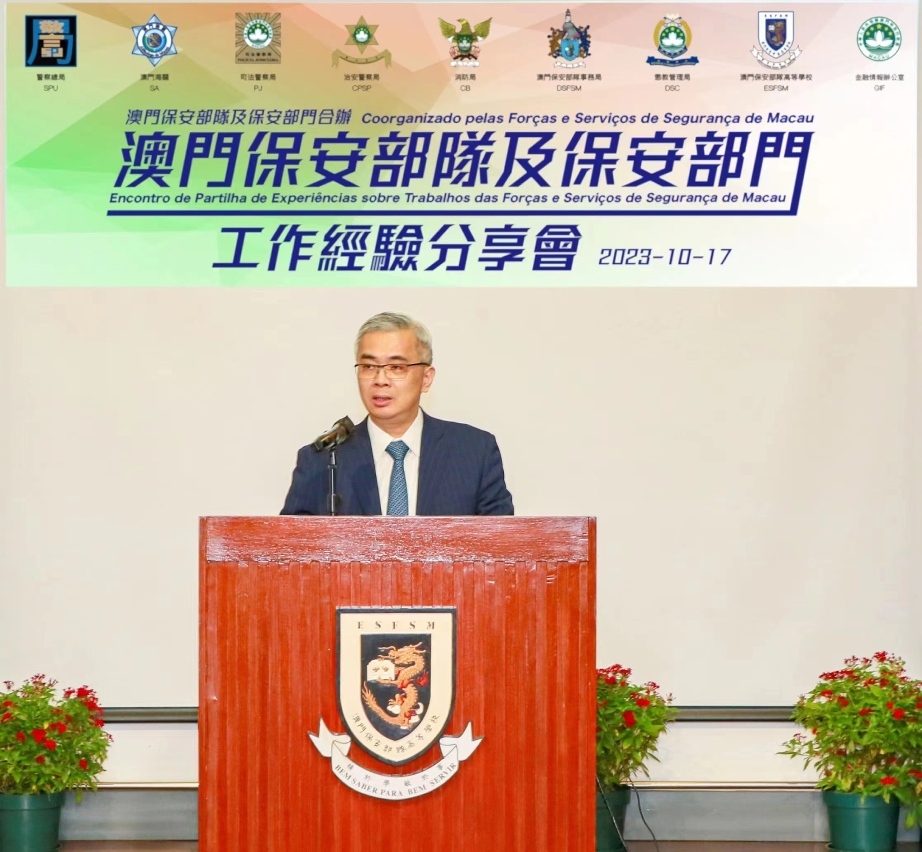 为强化警察的责任和担当,坚定人员的警务理念和核心价值。于10月17日上午,在澳门保安部队高等学校礼堂举办“2023澳门保安部队及保安部门工作经验分享会”。保安司司长黄少泽、警察总局局长梁文昌、澳门海关关长黄文忠,保安范畴辖下领导和各级人员代表出席,以及在各保安部队及保安部门设有15个直播点,合共660人参与是次分享会。