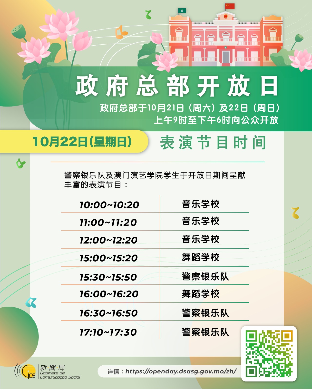 位于南湾大马路的政府总部今年是继2020年后再度举办开放日,欢迎居民和游客于10月21及22日到访政府总部。公众还可获赠纪念品,送完即止。同时,提醒公众在参观期间注意通道梯级,请勿携带宠物、雨伞、饮品和食品进入政府总部,参观时请勿使用自拍棒。