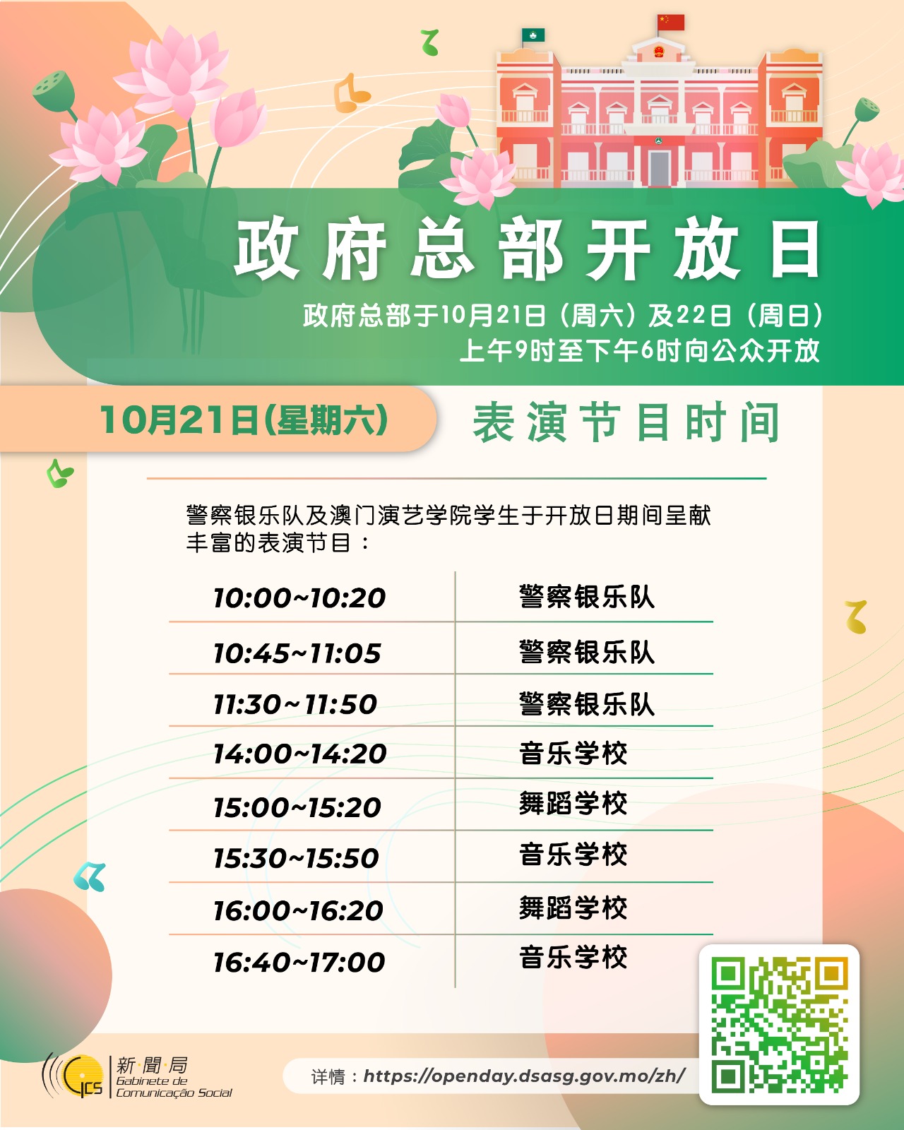 表演节目方面,两天开放日将安排丰富的节目供参观人士欣赏,包括治安警察局银乐队的乐器演奏、文化局演艺学院音乐学校和舞蹈学校学生的乐器演奏及舞蹈表演。邮电局在政府总部对面的南湾湖畔设置临时柜枱,为公众加盖当日的纪念邮戳,并发售开放日相关邮品。