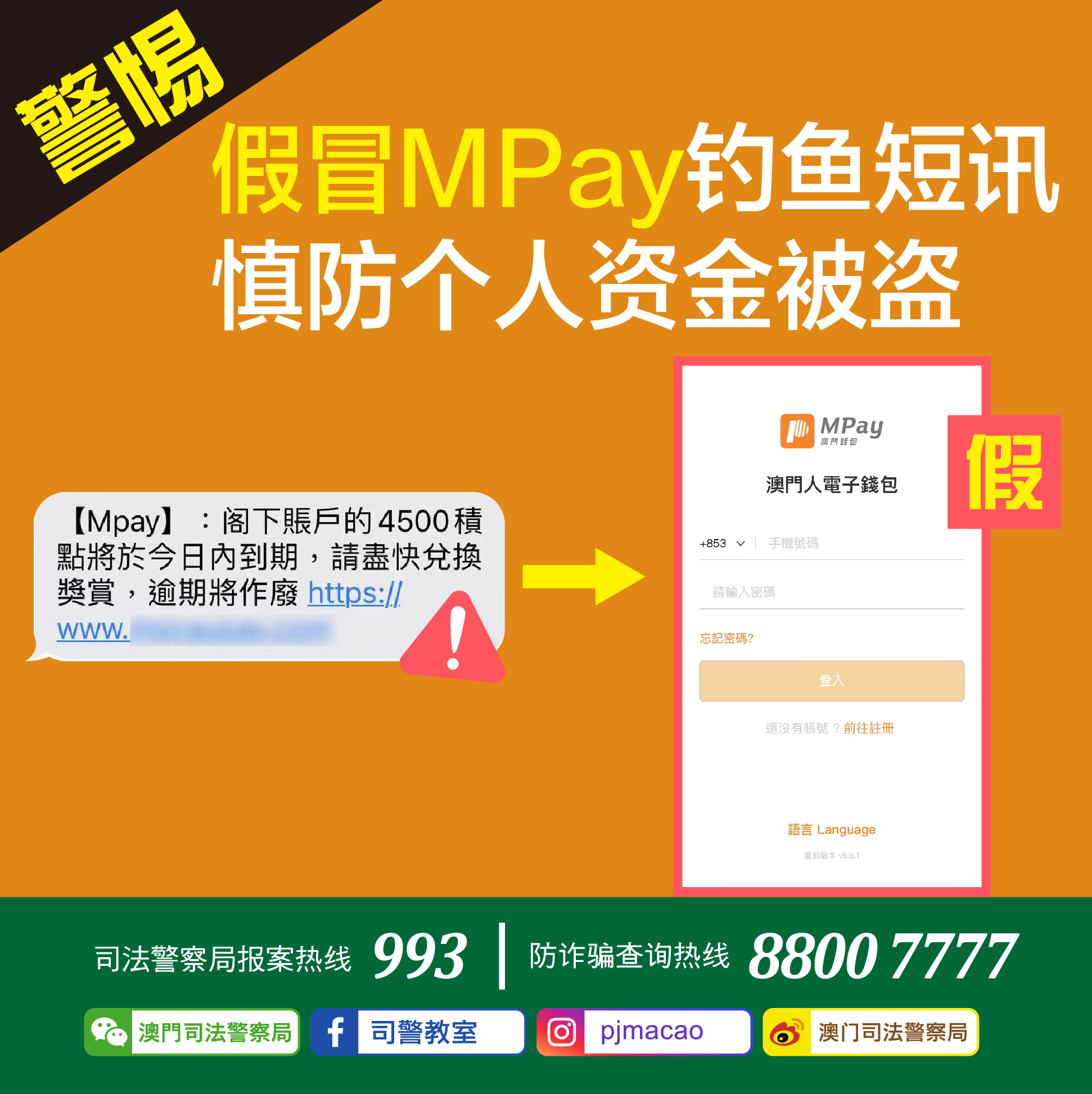 司法警察局今日接获多名市民举报,称其手机收到假冒MPay的钓鱼短讯,内容以积分点数到期须尽快换领奖赏为由,要求事主登入假冒网站并挑选欲以积分换领的奖品。过程中曾输入MPay的帐号、登入密码、一次性验证码及交易密码等资讯。