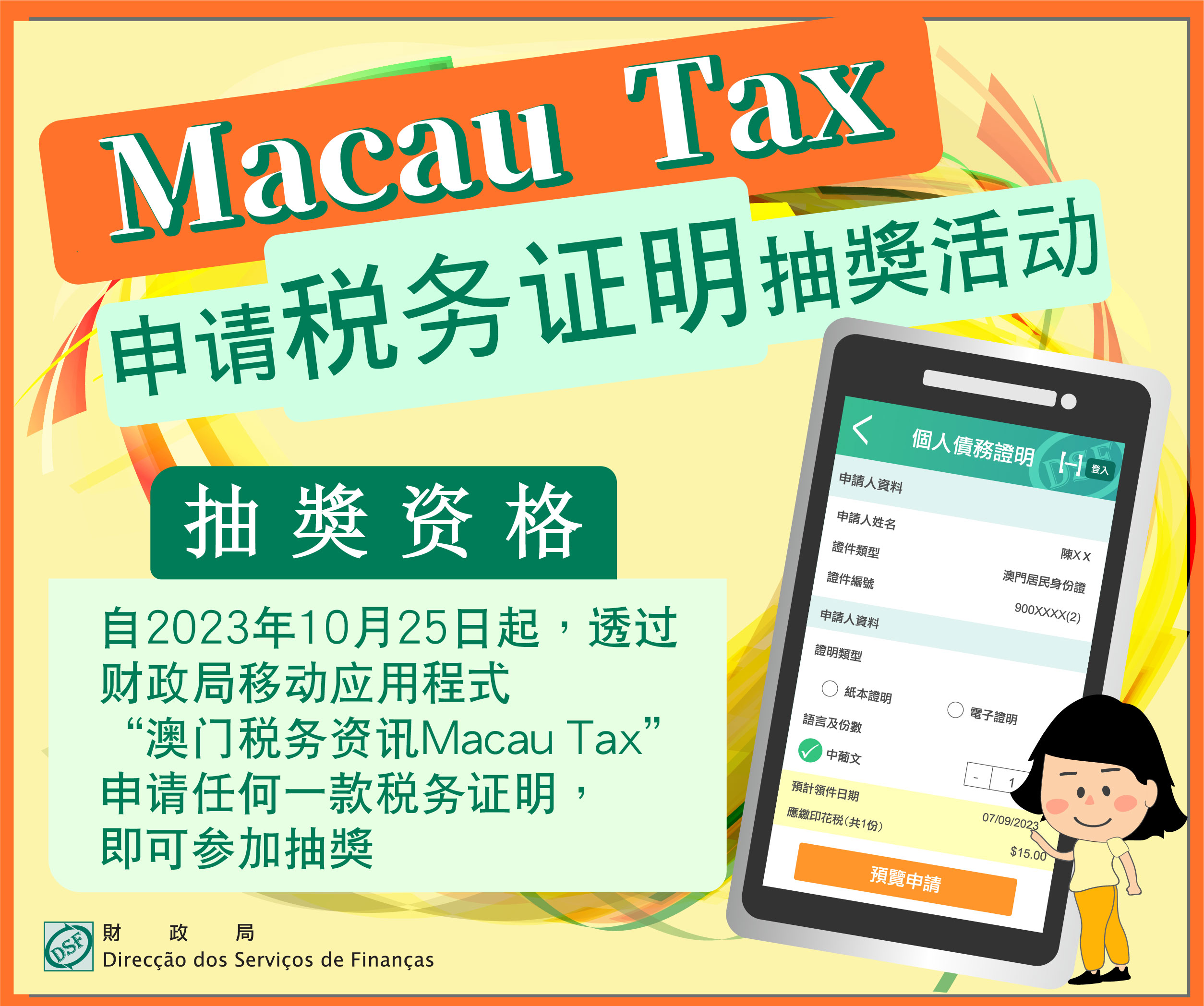 线上申请证明既环保又省时,为鼓励更多市民应用此项电子服务,自10月25日起,凡透过财政局移动应用程式“澳门税务资讯Macau Tax”申请任何一款税务证明,即可参加抽奬,并有机会获得超市礼劵澳门元100元,奬品送完即止。