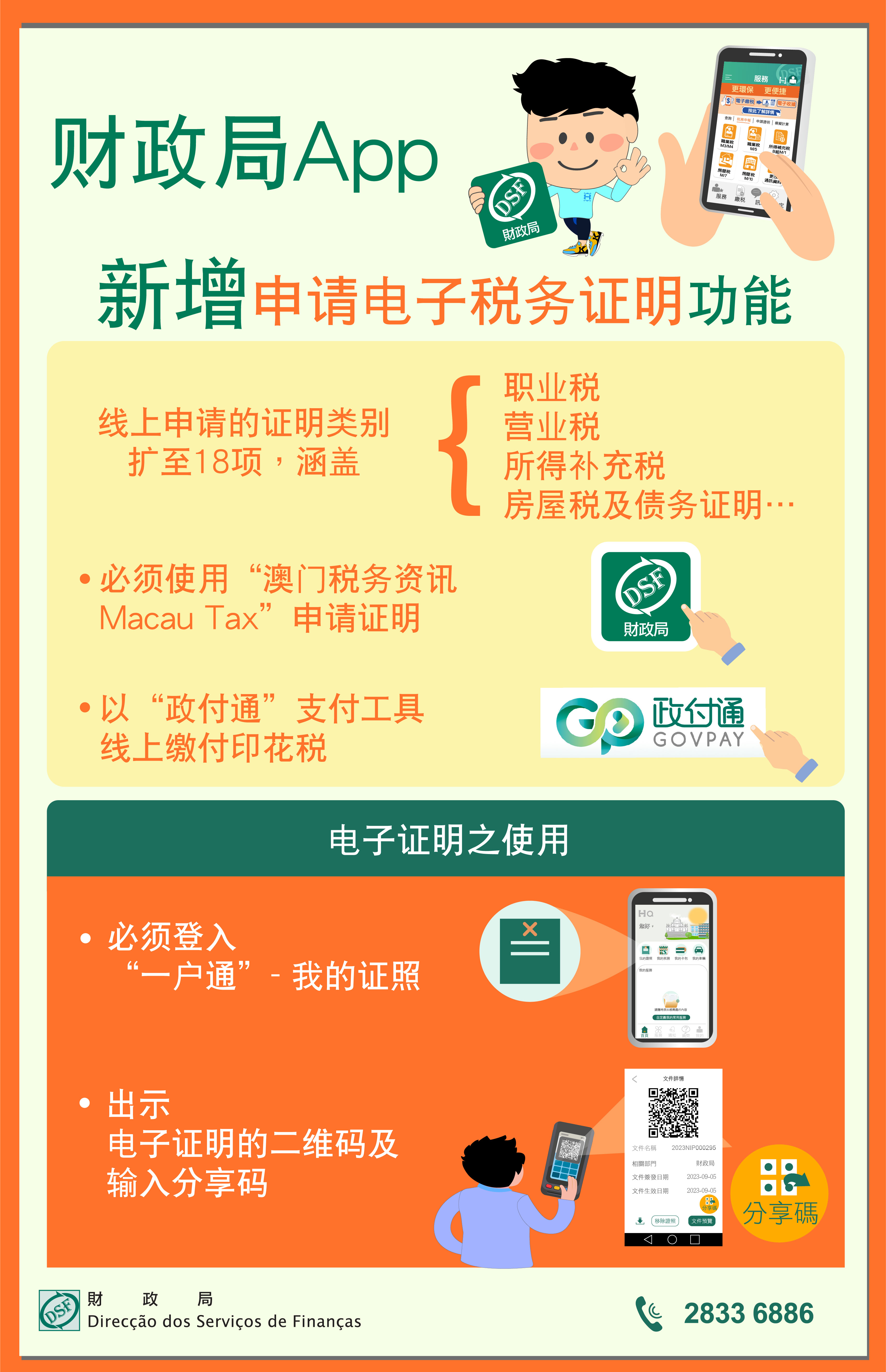 市民只须透过Macau Tax App内“申请证明”栏申请电子版本或纸本证明,并以“政付通”支付工具线上缴付印花税后就可完成申请手续;在领取证明时,只需按领件日期登入Macau Tax App下载电子版本,或前往指定地点领取纸本证明。