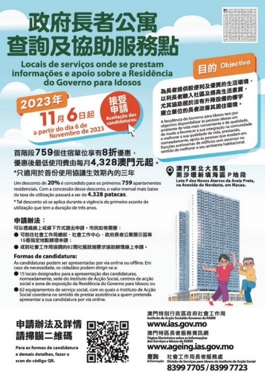 政府长者公寓将于明天(6日)开始接受申请,社会工作局鼓励长者透过线上方式办理申请公寓服务,呼吁长者的家人及亲友协助有需要的长者办理申请。市民可于明天(6日)上午9时起,登入「政府长者公寓电子申请系统」www.olderpersonsapart.ias.gov.mo进行线上申请;市民也可前往社会工作局总部、社会工作中心、政府长者公寓展示区等15个指定单位办理申请,同时,社会工作局已协调62个服务点,协助市民进行线上申请。
