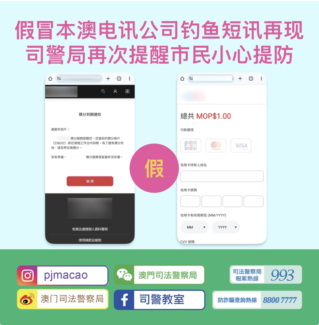 司法警察局本月初至今分别接获十多名市民检举,他们均报称分别接获假冒本澳某电讯公司的短讯,内容以积分点数到期须尽快换领奖赏为由,要求事主登入假冒网站,藉此套取个人资料及信用卡资料,有关案件合共造成损失约十三万澳门元。