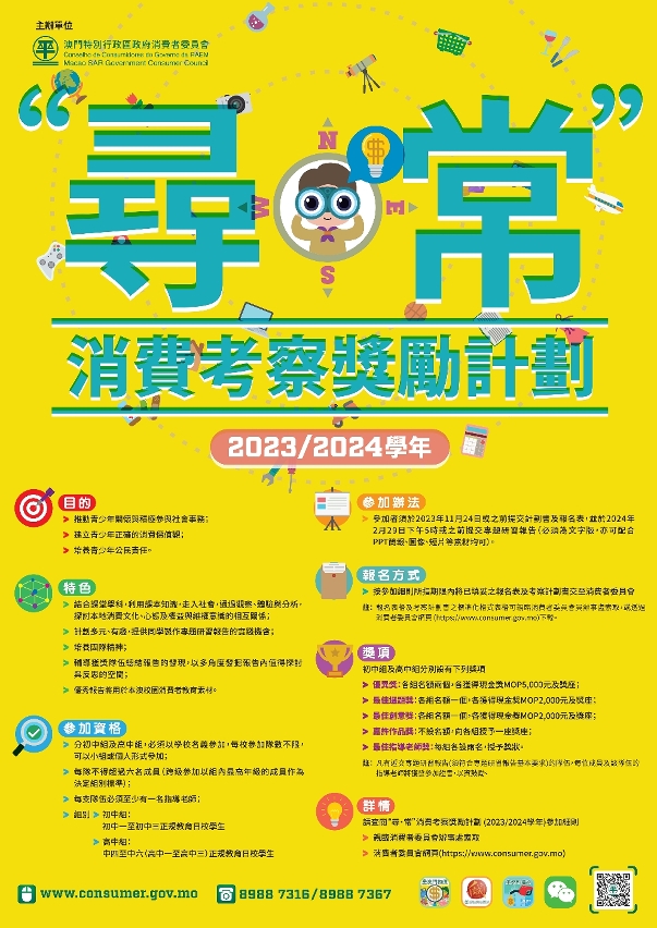 有意参加“寻・常”计划(2023/2024学年)的师生可登入消委会网页(https://www.consumer.gov.mo)查阅参加细则,以及下载该计划的报名表及计划书,消委会鼓励各级中学生踊跃报名,透过参加计划丰富学习经验。