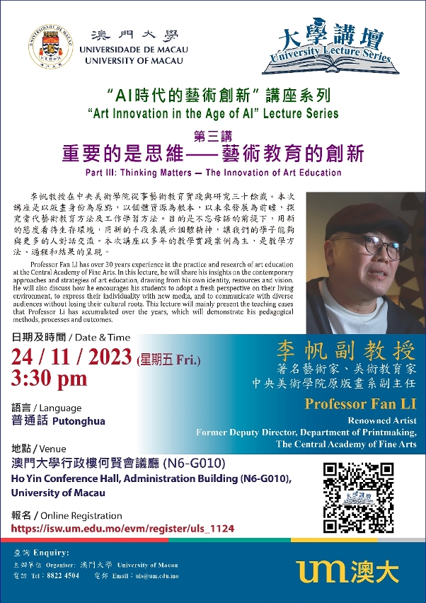 三场讲座将为澳大师生和社会各界提供难得的机会,听取中央美术学院三位名家的精彩演讲,了解AI时代的艺术创新的趋势和挑战,并与他们进行深入的交流和互动。查询请致电8822 8431与王先生联系。