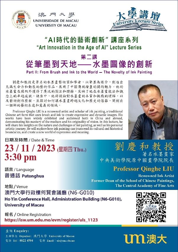 第二场讲座将于11月23日下午3时30分在澳大何贤会议厅(N6-G010)举行。着名水墨画家、中央美术学院原中国画学院院长刘庆和将主讲“从笔墨到天地——水墨图像的创新”,从水墨的本质、特征和发展历程,分析水墨图像的创新之道,并展示他在水墨艺术中的探索和实践。澳大人文学院葡文系教授姚京明将担任与谈者。报名网址:https://isw.um.edu.mo/evm/register/uls_1123。