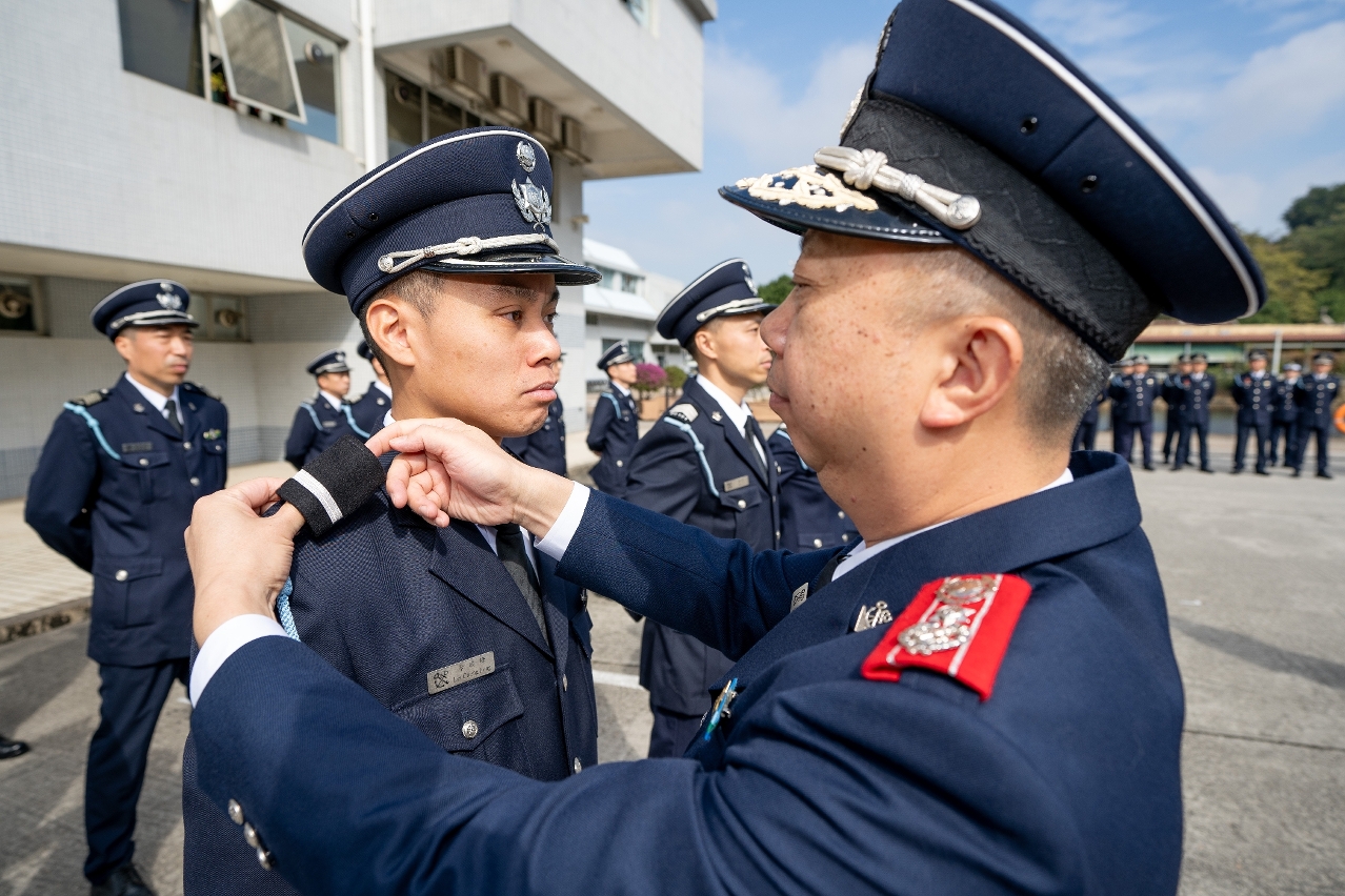 各晋升人员进行宣誓后,由海关关长黄文忠及副关长李煜辉分别为各人佩戴肩章,正式晋升成为副关务督察,仪式上同时亦向获得培训课程总成绩优异奖的人员李晴峰颁发奖项。